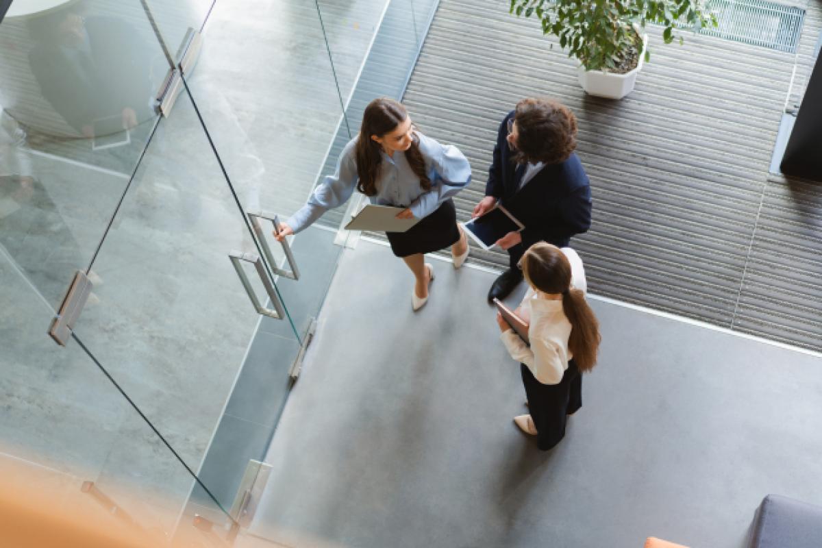 特にエントランス周りは企業の「顔」ともいえる部分。ブランディングの観点からもデザインを意識して選ぶと効果的です。社内でも、明るく開放的な空間を演出することで従業員の心理的な快適さを高められます。